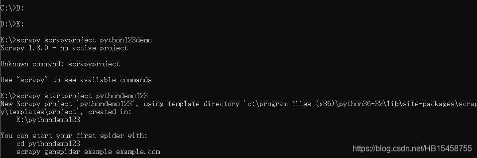打开cmd:输人scrapy scrapyproject python123,,如下截图: